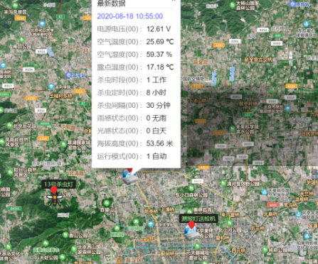 可擴展接入防治區(qū)域氣象環(huán)境參數(shù)和拍照圖片上傳,可以有效遠程掌握該區(qū)域氣象對防治蟲害的影響和運動時間范圍軌跡,同時可和圖片分析蟲害的分類等數(shù)據(jù)比對。
